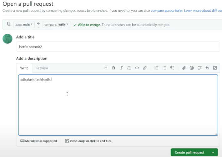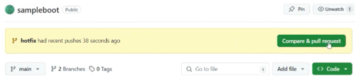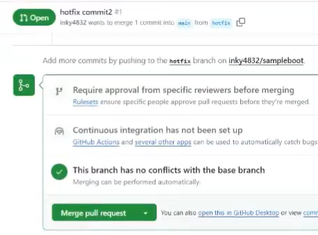 pull request 선택 ( 원격에서의 병합은 pull request )