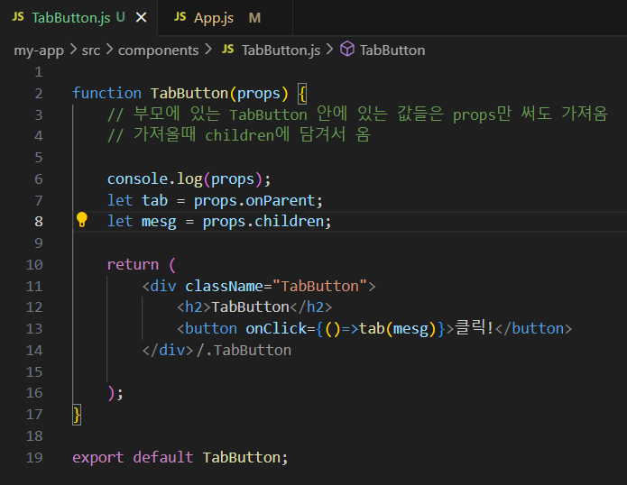 - JSX에서 이벤트 처리는 카멜표기법(onClick, onChange) 을 사용