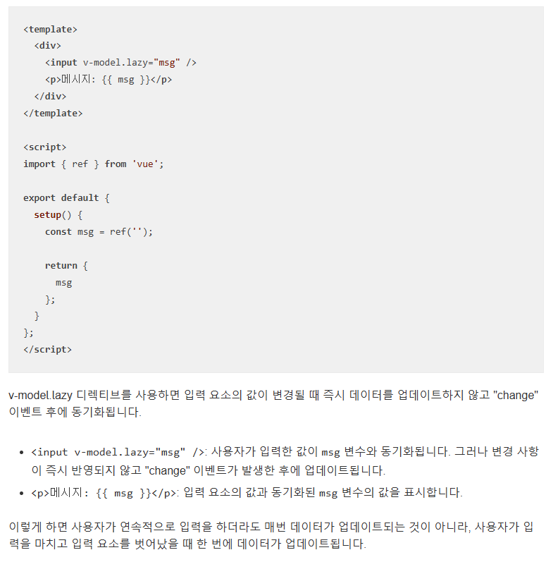 자료를 찾아보니 v-model.lazy로 하면 change이벤트가 반영된다