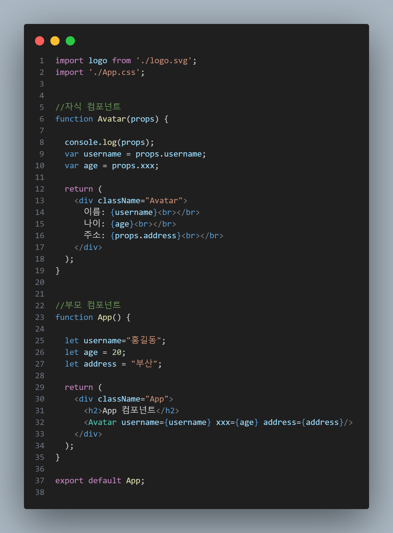 import logo from './logo.svg';import './App.css';import zzang from './assets/zz.jfif' //자식 컴포넌트const Avatar = (props)=>{ console.log(props); var username = props.username; var age = props.age; var children = props.children // children 안에 h2태그, img 태그 내용이 들어가있음 return ( div className="Avatar"> 이름: {username}br>br> 나이: {age}br>br> {children}br>br> div> );};//부모 컴포넌트fu..